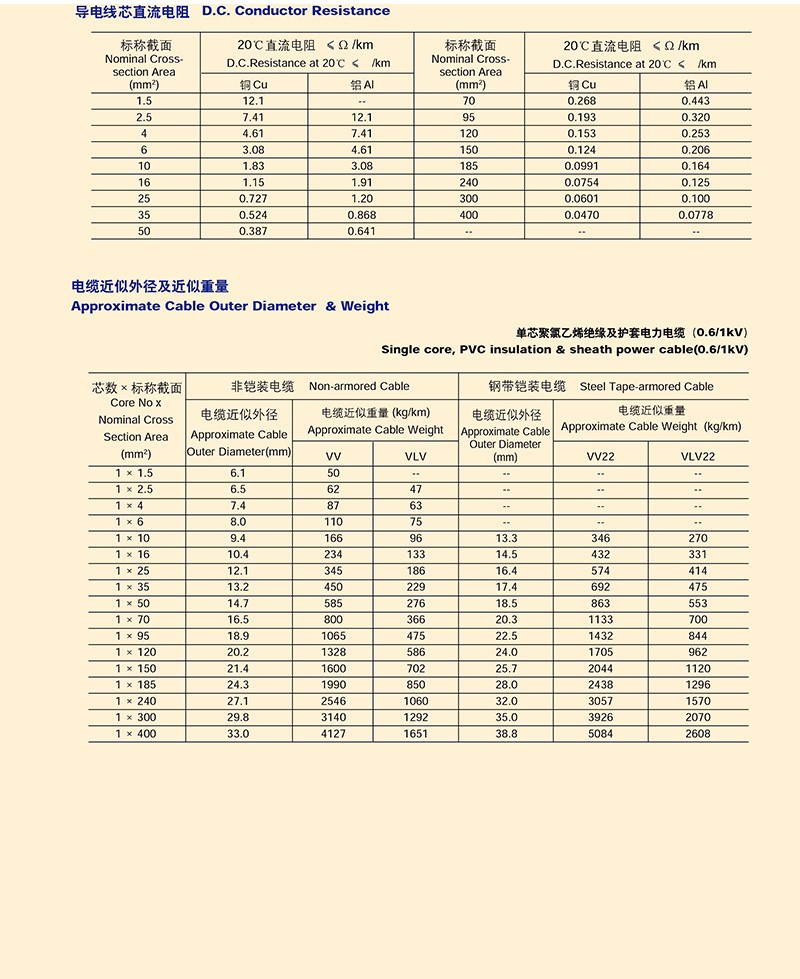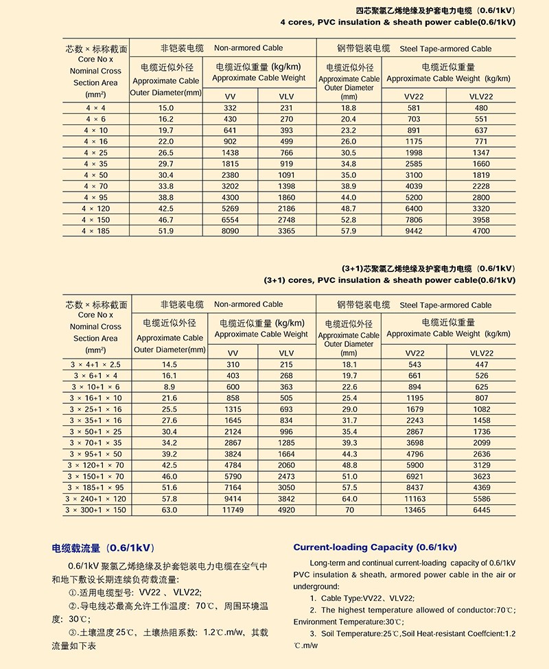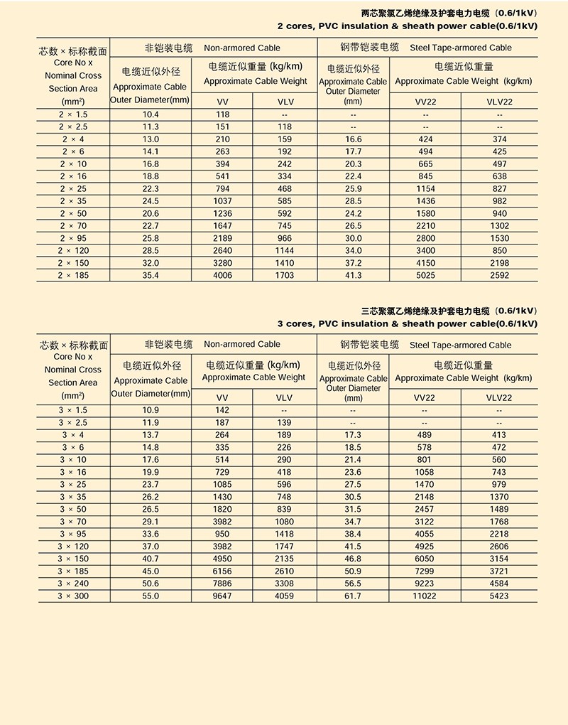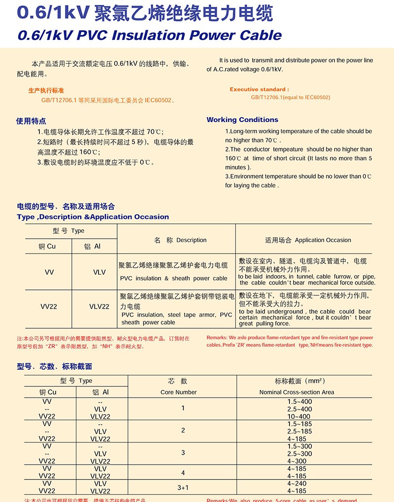 0.6/1KV聚氯乙烯绝缘电力电缆的产品详细介绍: